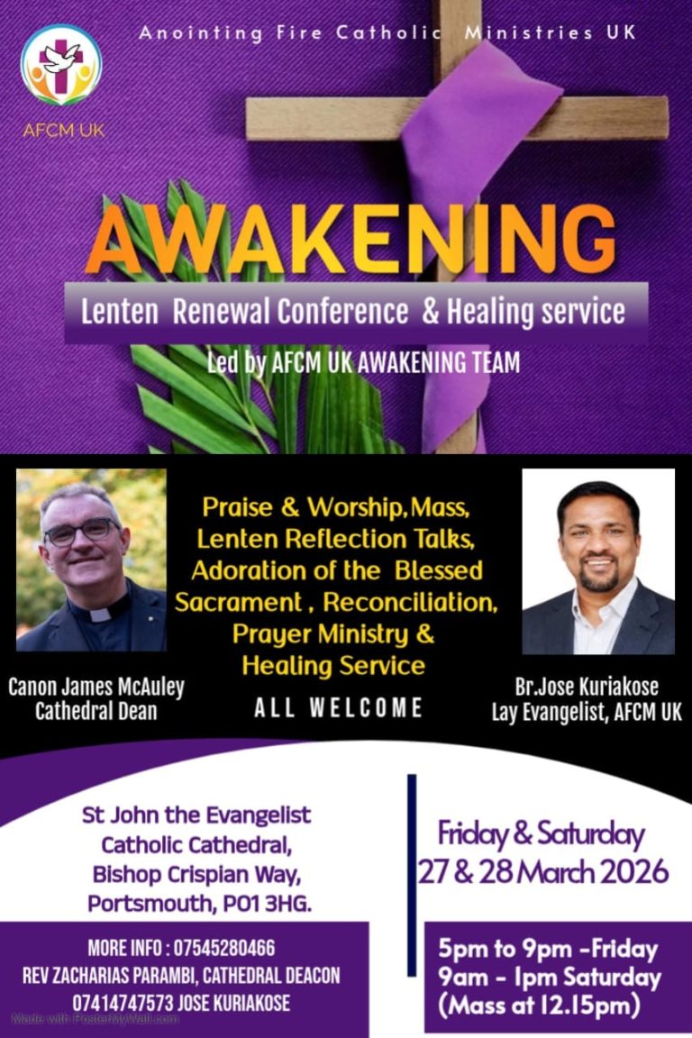 The AFCM UK Awakening Team is leading a Lenten Renewal Conference at St John the Evangelist Cathedral in Portsmouth on 27-28 March 2026 and everyone is welcome to come along.